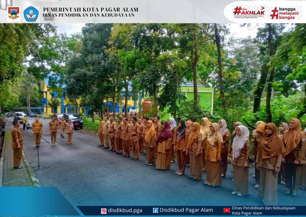 Dinas Pendidikan dan Kebudayaan Kota Pagar Alam melaksanakan apel rutin Senin pagi dipimpin oleh petugas dari Bidang Sekretariat.